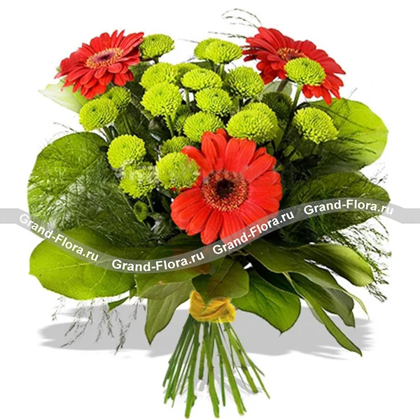 Стильно подобранная цветовая гамма и уникальный коллаж цветов! Композиция из гербер, хризантем и декоративной зелени, действительно универсален! Букет удивит как солидного юбиляра, так и любимого артиста. И, конечно же, будет приятным сюрпризом на первом свидании и станет отличным утренним подарком любимой, который разбудит ее, подарив превосходное настроение.