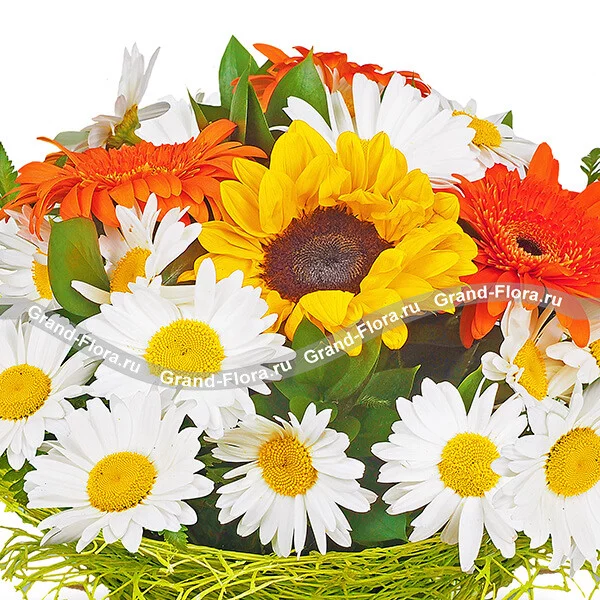 ЛЮКС: ромашка белая - 20 шт, гербера оранжевая - 5 шт, подсолнух - 2 шт, рускус, папоротник - 7 шт, сетка зеленая.