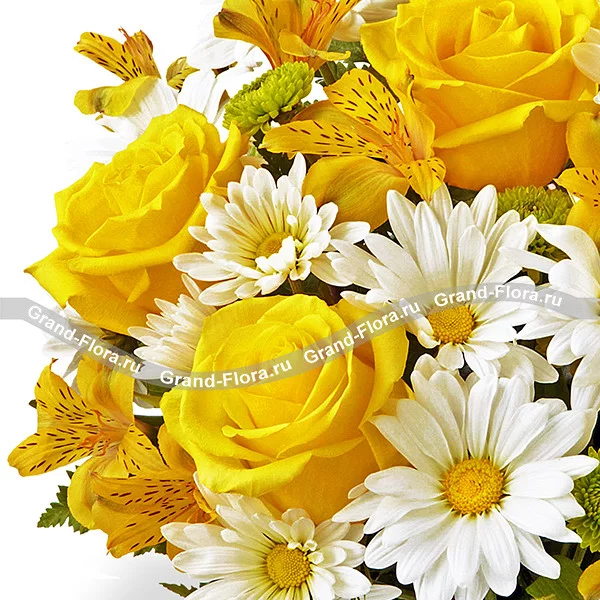 Люкс: роза желтая - 7 шт., хризантема белая кустовая - 3 шт., хризантема зеленая (сантини) - 3 шт., альстромерия желтая - 4 шт., папоротник - 3 шт., упаковка. Примерный размер: 30Х30 см.