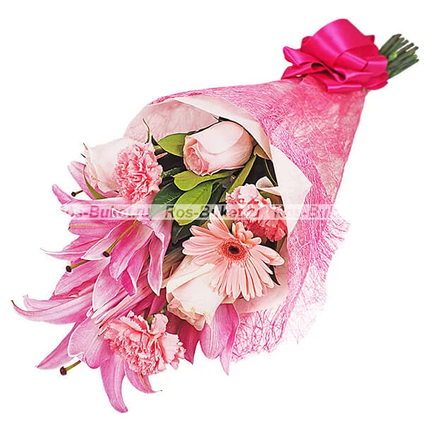 ЛЮКС: Лилия розовая - 2 шт, гербера розовая - 3 шт, роза розовая - 5 шт, гвоздика розовая - 5 шт, упаковка, бант розовый.