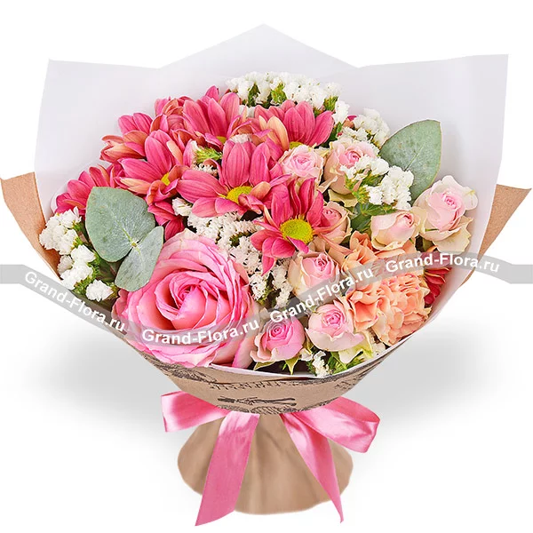 Стандартный: роза розовая - 2 шт., кустовая хризантема темно-розовая - 3 шт.,кустовая роза розовая - 2 шт., гвоздика персиковая - 2 шт., статица, эвкалипт, упаковка, лента. Примерный размер: 30Х30 см.